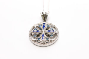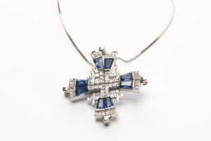 Jerusalem Cross Pendant – White Gold , Diamond, Sapphire